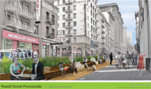 The pro-bono design team for the Powell Street Promenade, which includes the firm Royston, Hanamoto, Alley and Abey (RHAA) and BAR Architects, have worked with the community to develop a preliminary concept vision for the project site. Following the model of the Pavement to Parks program where local designers work free of charge to develop plans for new and innovative public spaces around the City, the Powell Street Promenade will be the marquee Pavement to Parks project in 2011. Other, smaller projects are also being planned for neighborhoods throughout the City.