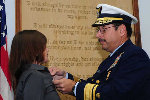 Photo:SAUSALITO, Calif. - Rear Adm. Joseph Castillo, 11th District commander, pins the Coast Guard Medal on to Kristin Lunkley, a former crewmember at Coast Guard Station Golden Gate, Wednesday, Dec. 8, 2010. Lunkley received the Coast Guard Medal for extraordinary heroism during a 2008 rescue. U.S. Coast Guard photo by Petty Officer Pamela J. Manns.