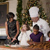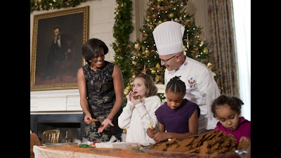 First Lady Michelle Obama and White House Pastry Chef Bill Yosses laugh as young visitor tastes her decorated cookie during a holiday craft demonstration with the children of military personnel in the State Dining Room of the White House, Dec. 1, 2010. (Official White House Photo by Lawrence Jackson)