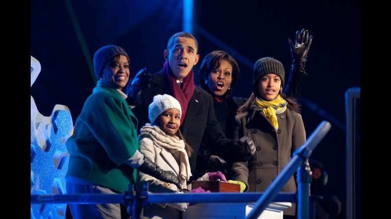 President Barack Obama, with mother-in-law Marian Robinson, daughters Sasha and Malia, and First Lady MIchelle Obama, react as they push to button to light the National Christmas Tree during a ceremony on the Ellipse in Washington, D.C., Dec. 9, 2010. (Official White House Photo by Chuck Kennedy)